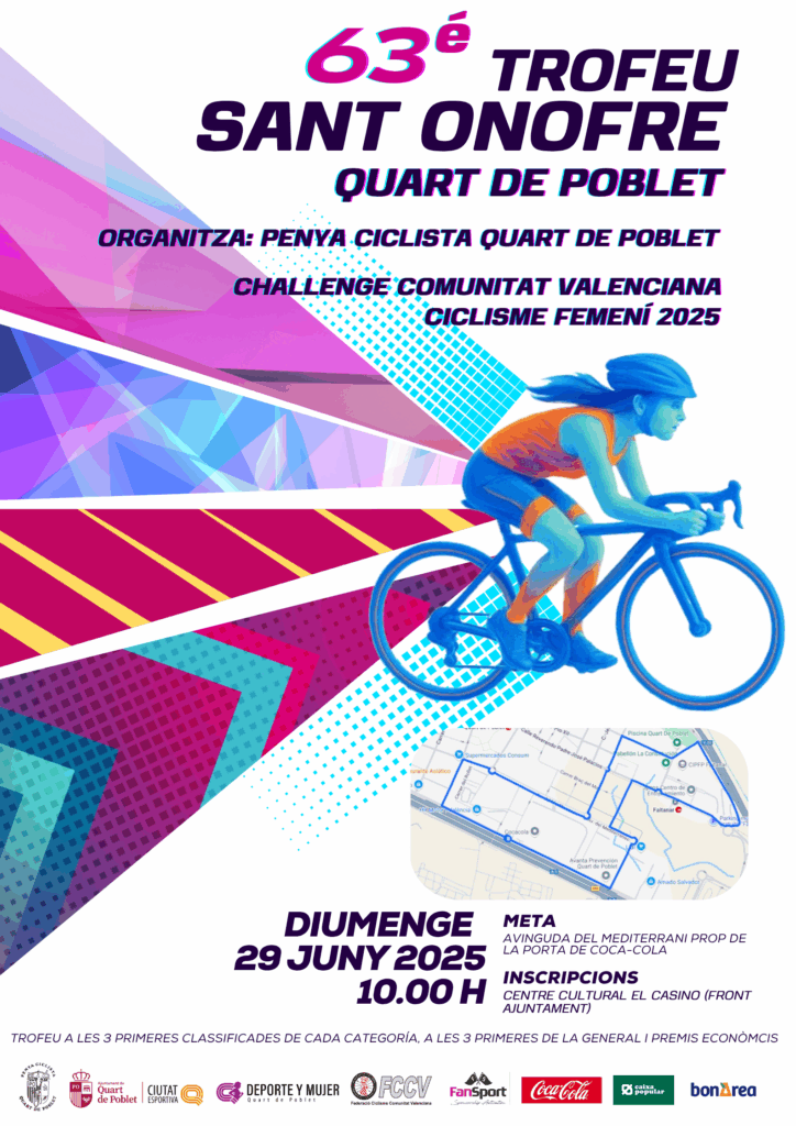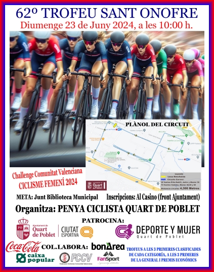 El pasado domingo 23 de junio de 2024 la Penya Ciclista Quart de Poblet en colaboración con la Federación de Ciclismo de la Comunidad Valenciana y con el gran apoyo del Ayuntamiento de Quart de Poblet organizó coincidiendo con su tradicional Trofeo de Fiestas de Sant Onofre la primera prueba ciclista femenina de nuestra localidad.